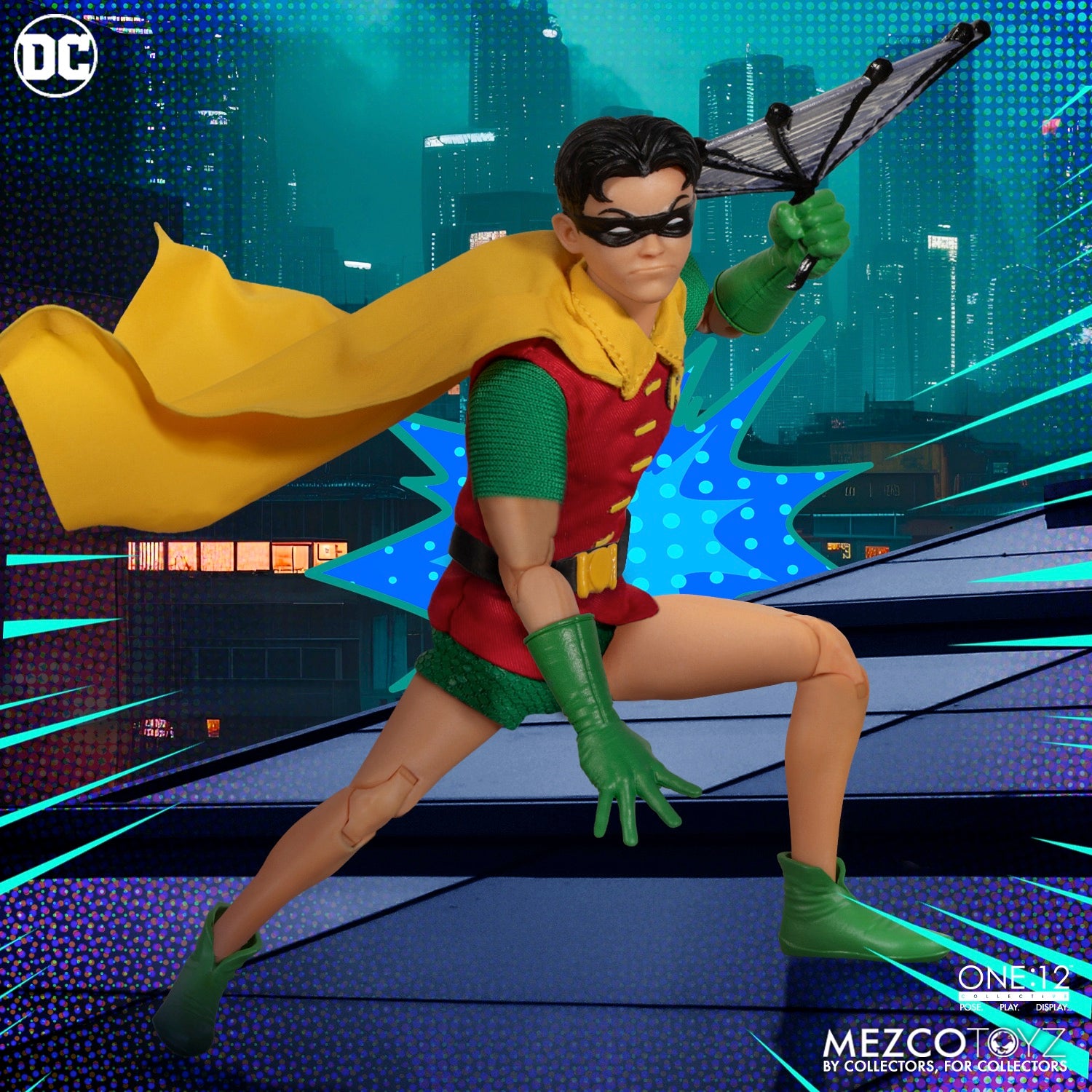 The One:12 Collective Robin: Golden Age Edition wears a tunic with an 'R' insignia over his fitted bodysuit, a utility belt, and a cape with an integrated posing wire, capturing his classic comic book appearance. The Boy Wonder comes complete with three head portraits with varying expressions.