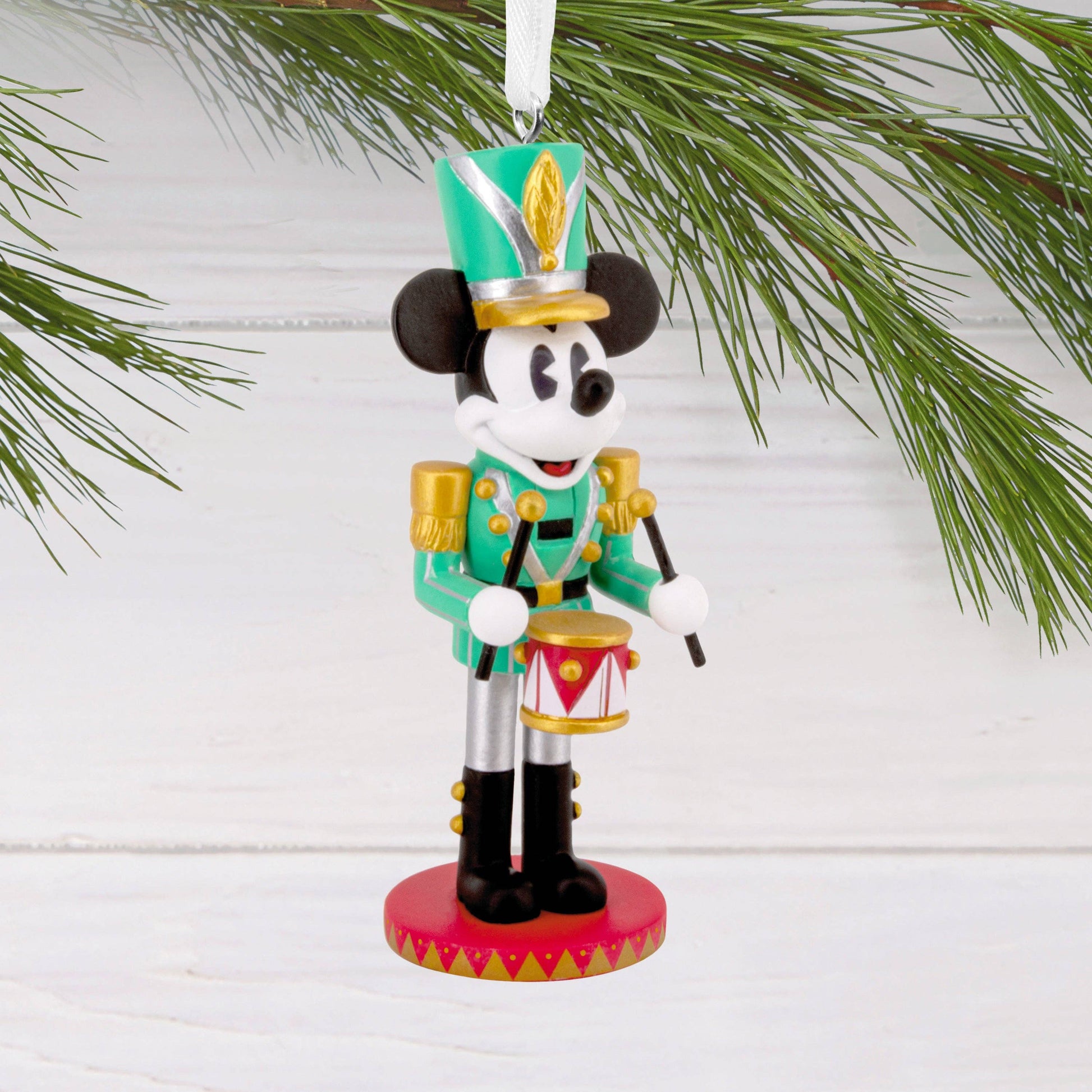 This Nutcracker tree decoration is made from hardwearing resin, features Disney's Mickey Mouse in a green drummer's uniform design and comes complete with a hanging loop and white ribbon.