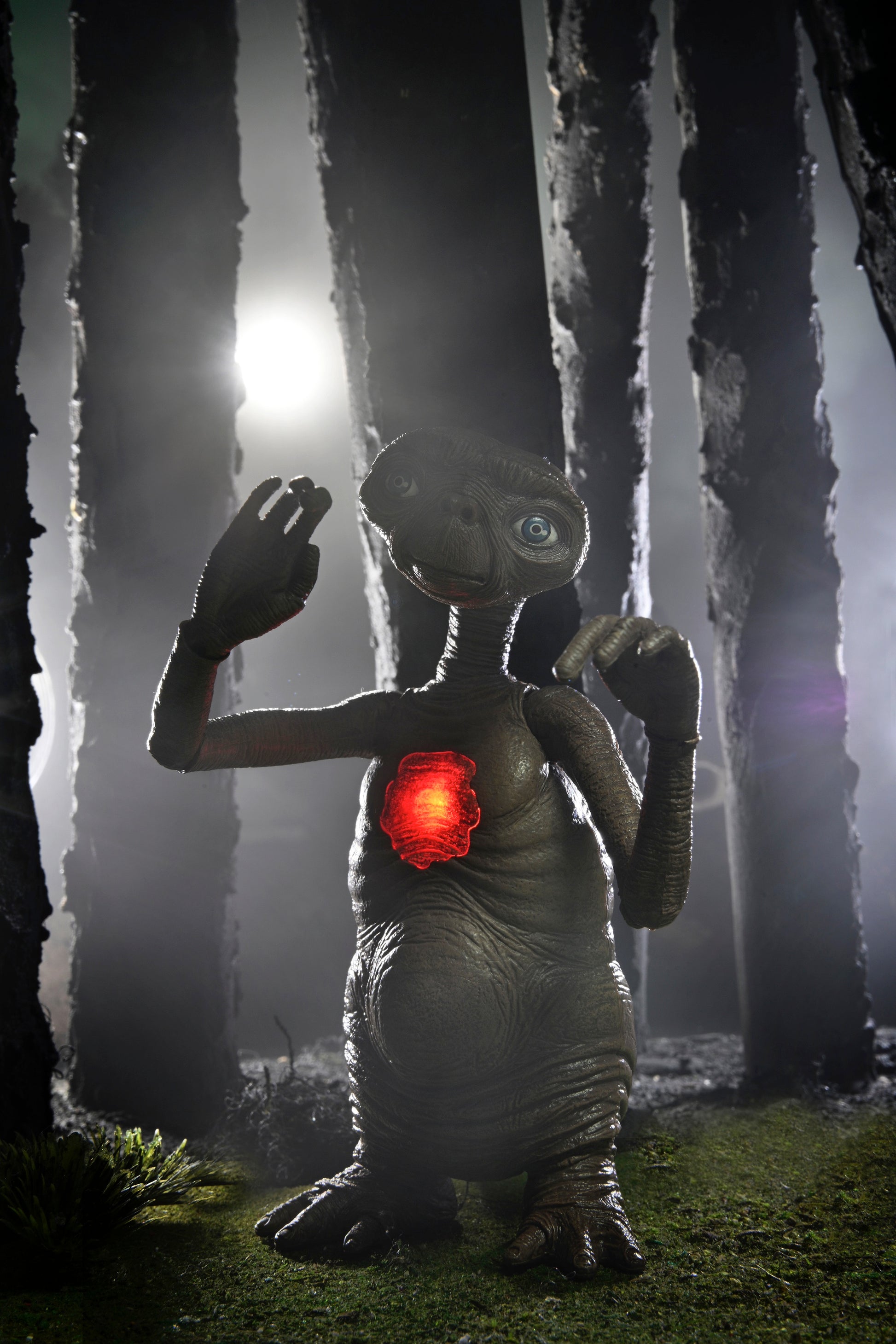 This Ultimate action figure celebrates the 40th anniversary of the beloved classic! Bring the magic and excitement of E.T. The Extra-Terrestrial into your world. As your friendship with E.T. grows, relive all of his earthly encounters or look to the stars and create your own unforgettable interactive adventures. This Deluxe Ultimate figure features a light-up LED chest just like in the movie! It comes with the large communicator device built in the movie to "Phone Home," potted plant, and interchangeable necks and hands. E.T. stands in 7" scale (meaning the figure is about 4.5" tall) and is posable.