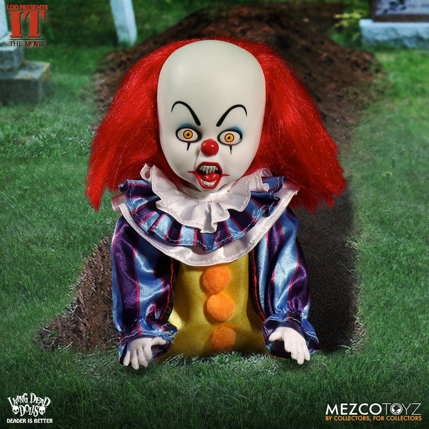 The Living Dead Dolls Presents IT 1990: Pennywise stands 10 inches tall, and has 5 points of articulation. He features real cloth clothing and comes with his red balloon. He is packaged in a custom die-cut window box perfect for display.
