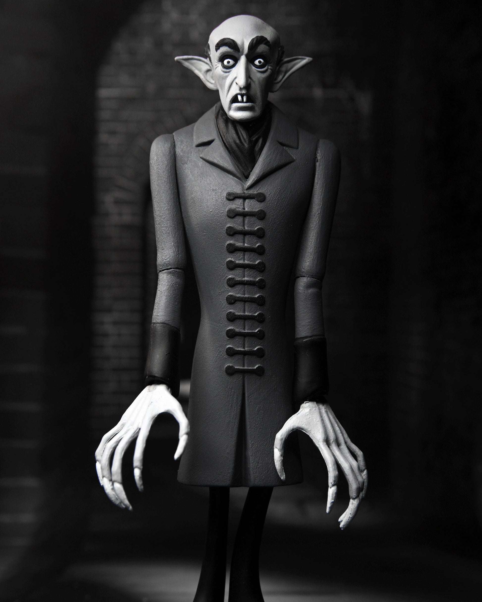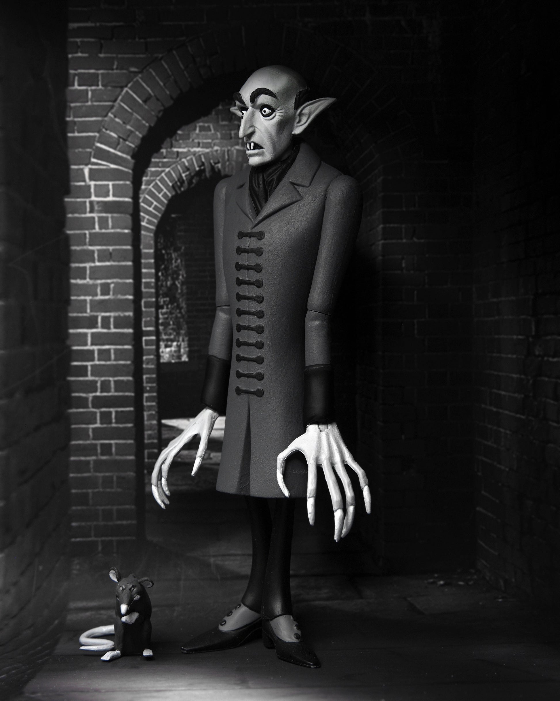 Bring the fun of Silver Age cartoons to your horror collection with the adorable little creeps of Toony Terrors, NECA's line of stylized horror icons! The Silver Screen Edition series brings to life fan-favorite characters from classic black-and-white media. Standing approximately 6 inches tall, this Count Orlok (Nosferatu) action figure features a grayscale deco with rat accessory and comes in special black-and-white packaging with cutout backdrop and silver foil logo.