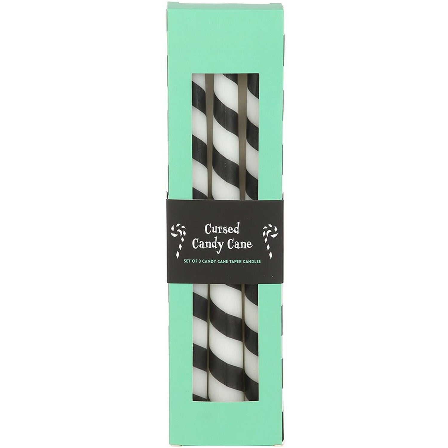 Add a gothic twist to festive decor with this set of 3 black candy cane printed taper candles. Perfect for those who love alternative Christmas accessories, these unscented candles will create a hauntingly elegant table setting. Whether for a spooky seasonal celebration or as a unique gift for someone with a love for the unusual, these candles are sure to make a statement. Approx. 5 hours burn time per candle.