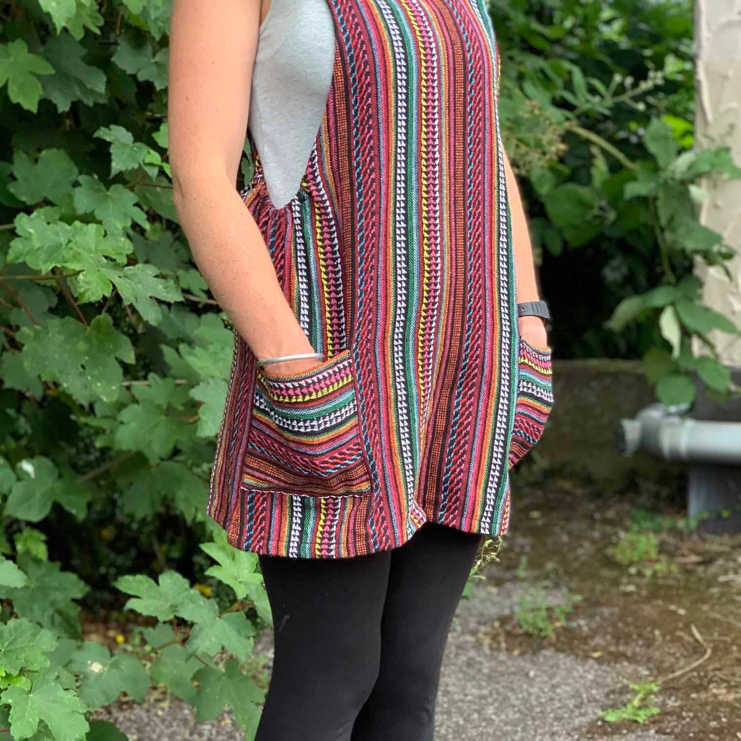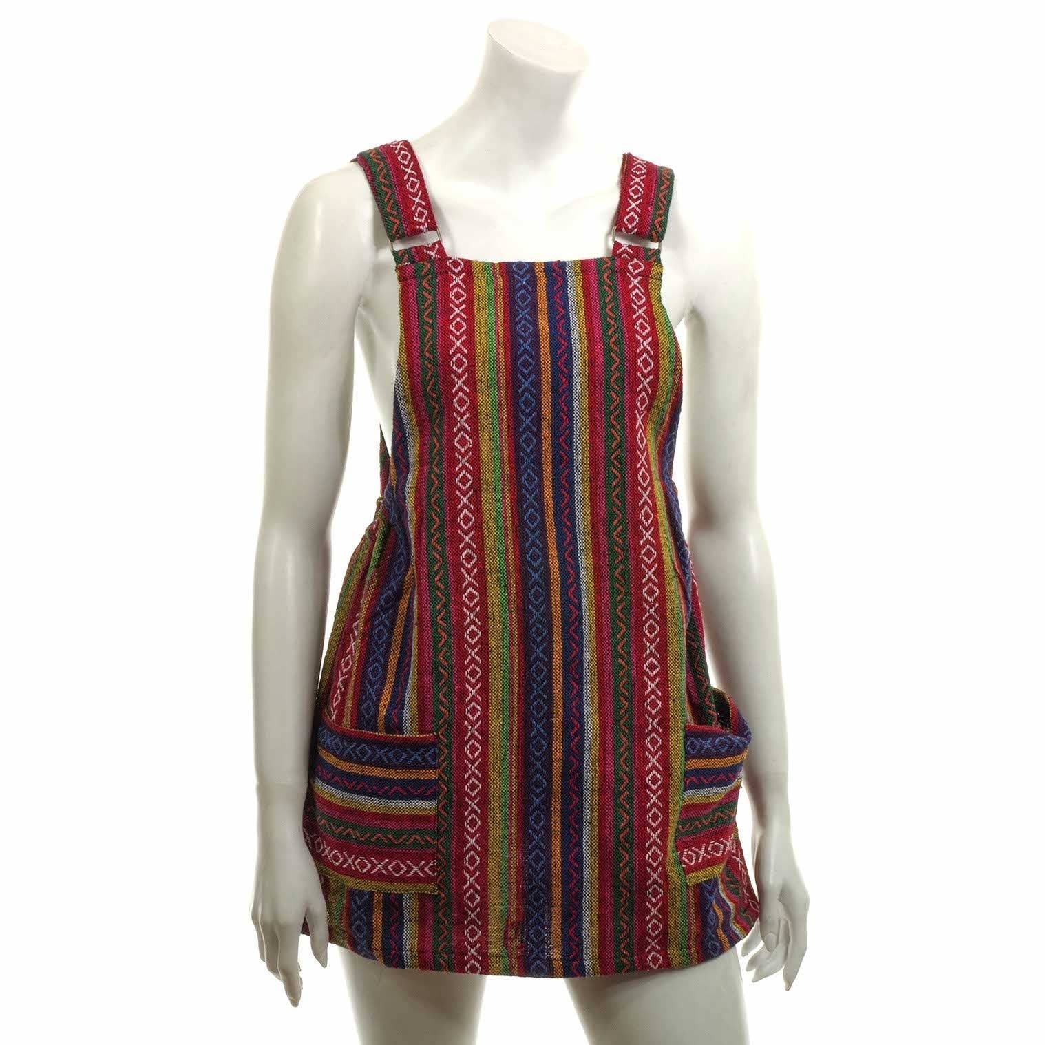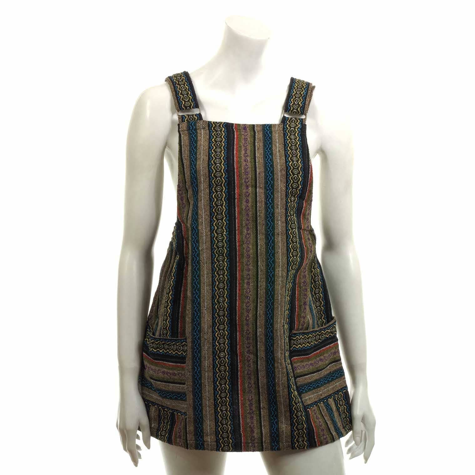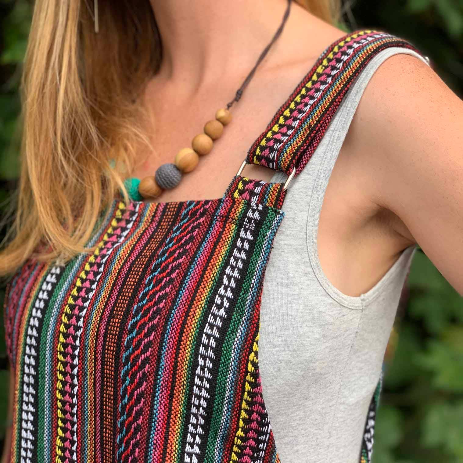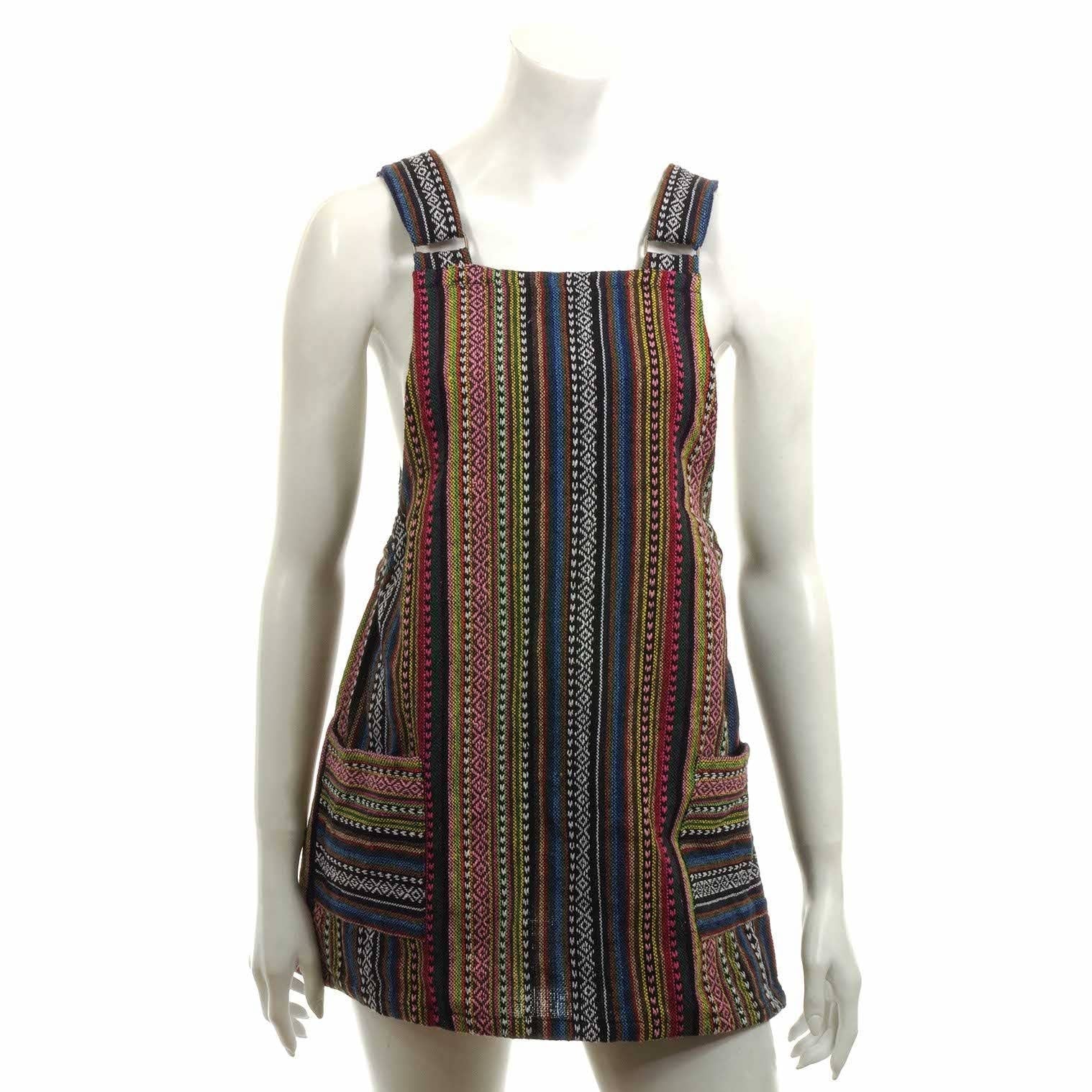These beautiful handmade short dungaree dresses are crafted from our unique Thai weave fabric. Each dress features adjustable straps and twin front pockets. We always try to update our photos to show our current stock, but please note that colours and patterns will vary. One size fits most. Hem width is 55cm, and the length from neckline to hem is 63cm.
